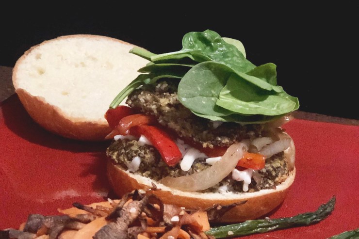 Although the mushroom burger pictured with caramelized onions, smoked vegan mozzarella, and spinach on a bun, this can also be eaten as is, with a salad, pasta, etc.