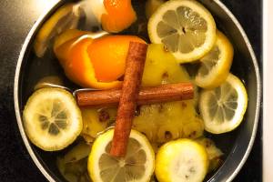 Using a small or large pot, I add slices or chunks of fresh pineapple, fresh navel orange peels, ginger, slices of lemon, cinnamon sticks, a dash of cinnamon & nutmeg powder and of course, water.