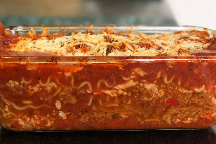 - Repeat steps 4-6 until lasagna is filled to the top of baking pan