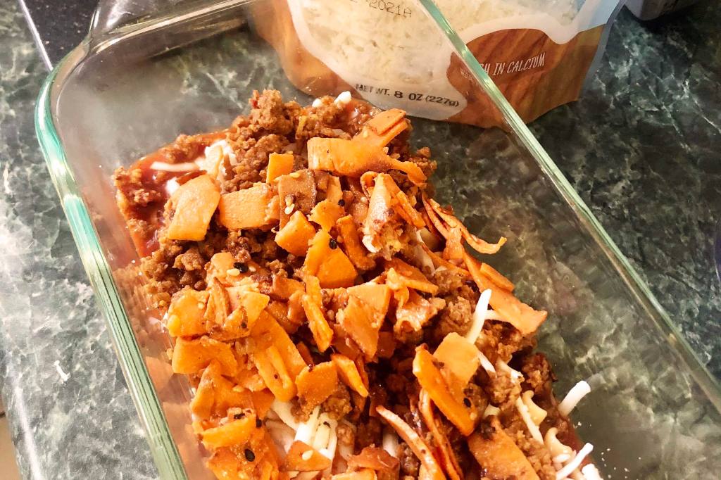 - Top with layer of beefless ground, sweet potato ribbons, and Trader Joe’s Almond Mozzarella Style Shreds