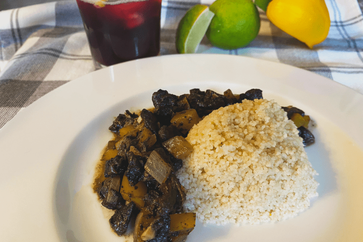 - In a large enough Tupperware or large bowl, mix sliced baby bella mushrooms, chopped onion, yellow pepper, mince garlic cloves, ginger, 3 tsp of jerk sauce, 3 tsp of oil, and squeeze 3 lime wedges